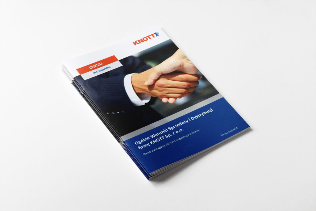- Wszelkie informacje o towarach, reklamy lub cenniki KNOTT, nie stanowią oferty w rozumieniu przepisów kodeksu cywilnego, ale są wyłącznie zaproszeniem do podjęcia rokowań w celu zawarcia umowy. Rysunki, ilustracje, wymiary, waga oraz pozostałe dane są wiążące jedynie, jeżeli zostanie to wyraźnie wskazane na piśmie.